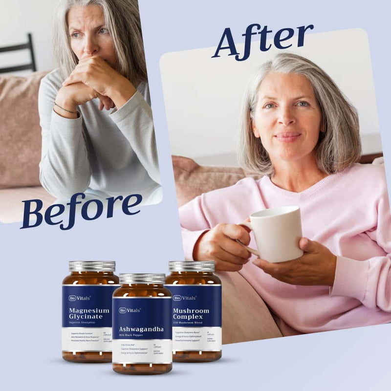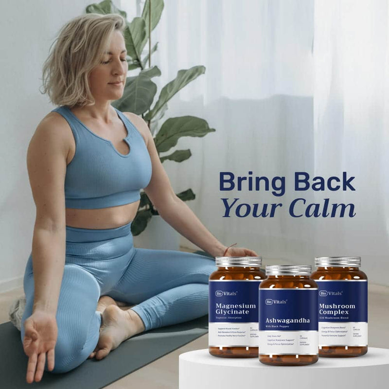 BioVitals® Ashwagandha uses premium organic root extract with Piperine for enhanced absorption. This adaptogenic herb reduces stress, balances cortisol levels, promotes restful sleep, and effectively targets stubborn belly fat caused by chronic stress.*