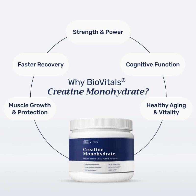 BioVitals® Creatine Monohydrate is a pure, micronized formula widely recognized for boosting memory, supporting brain health, and improving overall vitality. Many users report noticeable increases in energy, less fatigue, and greater willpower for daily life.*