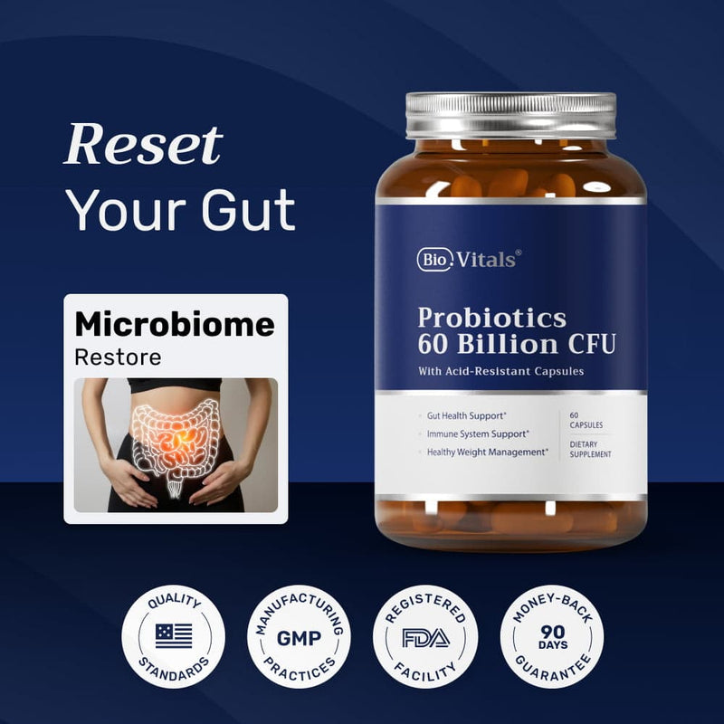 Since only 1 in 10 Americans have a healthy microbiome, adding Probiotics to your daily routine is essential. BioVitals Probiotics, with 60 billion CFUs and an advanced delivery system, effectively support gut balance.